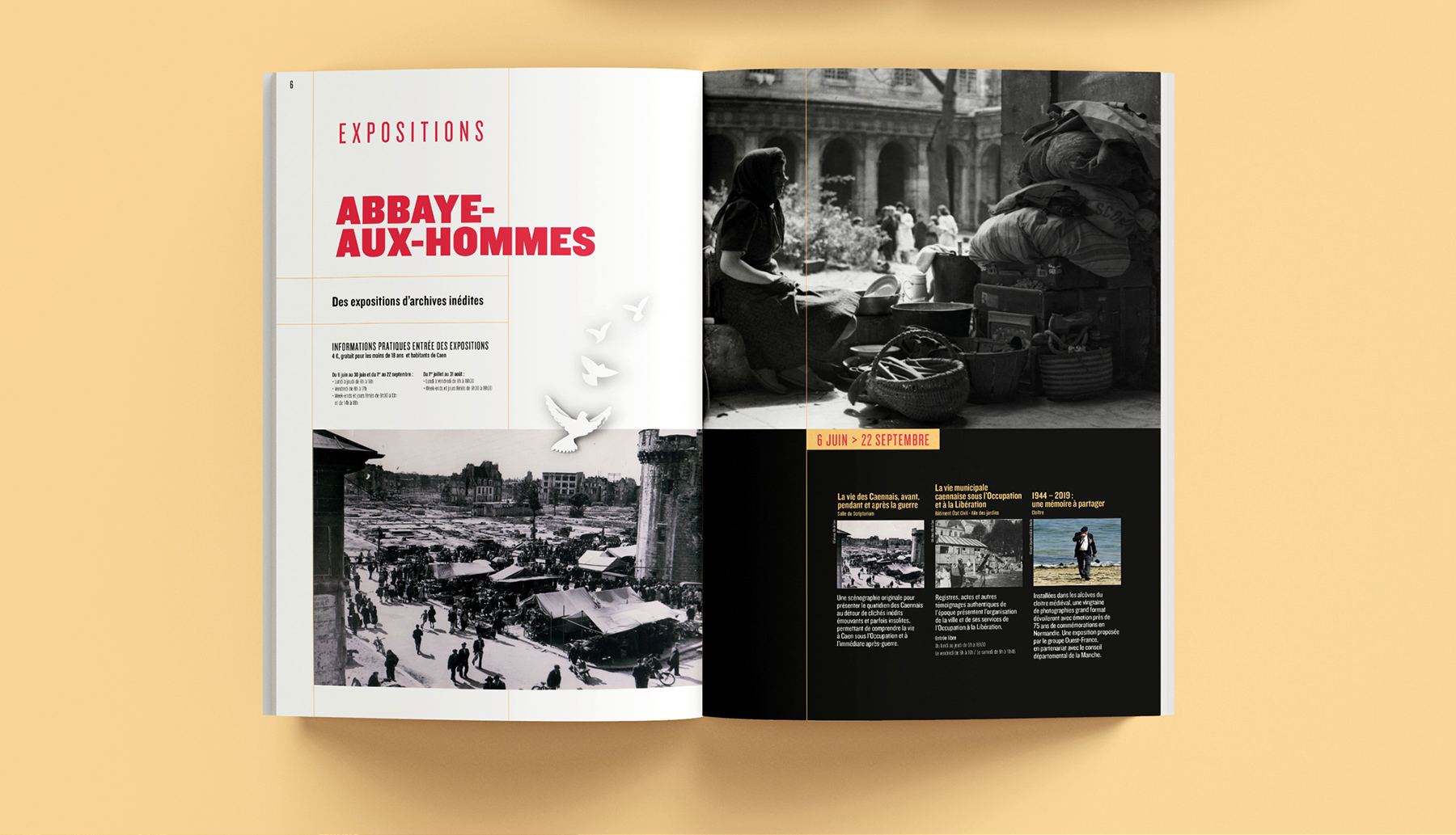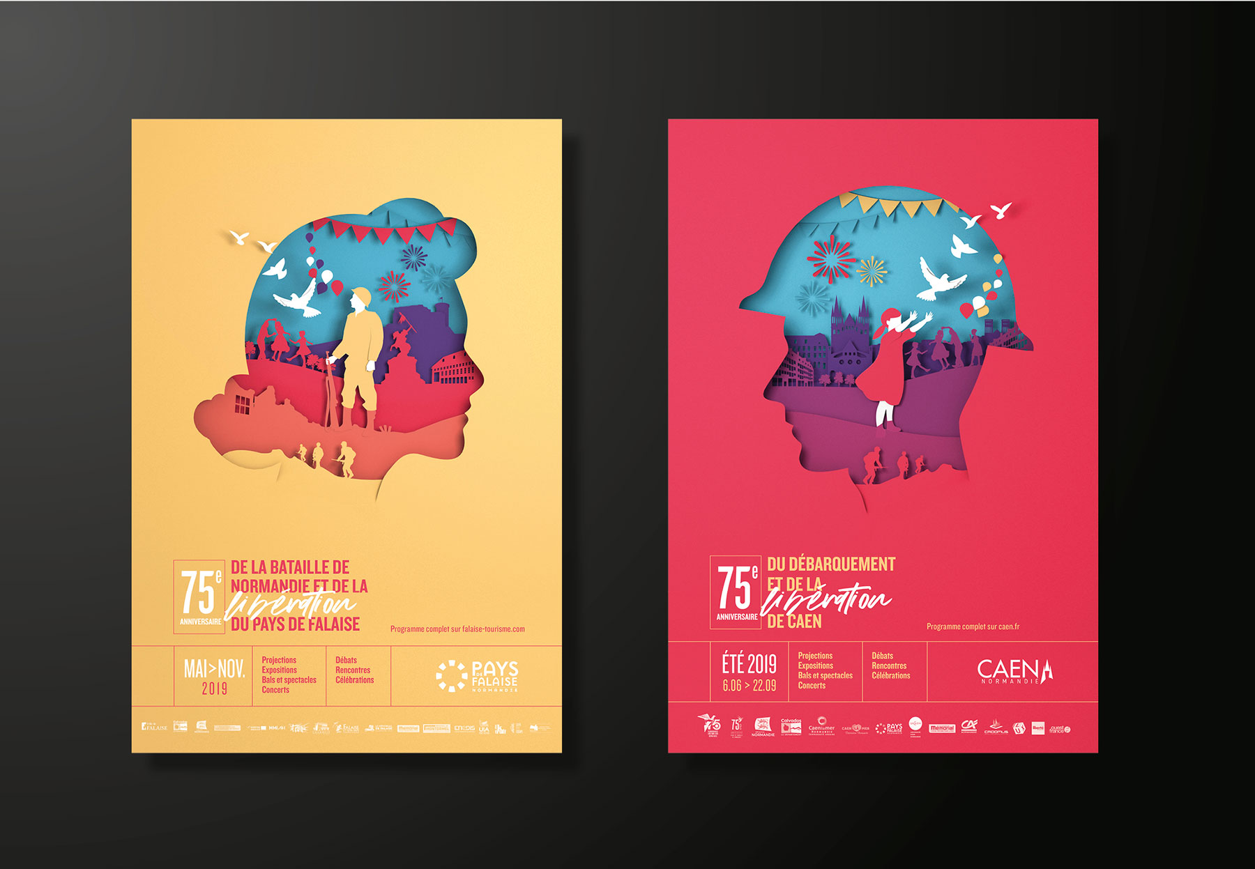 Le 75e anniversaire du Débarquement allié fut l’événement majeur de l’année 2019 en Normandie. À cette occasion, la Ville de Caen réserva aux Caennais et aux visiteurs un programme de temps forts commémoratifs et d’animations plus festives sur le thème de la liberté, de juin à fin juillet. Au-delà de l’hommage solennel aux victimes civiles et militaires, la Ville souhaitait proposer au grand public une approche plus pédagogique, voire ludique, de l’histoire caennaise. Aux nombreux visiteurs attendus durant la saison touristique, il s’agissait de proposer un autre regard sur la ville, trop souvent et à tort associée à l’idée de « ville martyre, ville détruite ». La communication autour de l’événement s’articula donc autour de deux axes : faire connaître la diversité des animations proposées et faire aimer la ville. De ces objectifs émergea la nécessité d’un visuel fort, véhiculant un message commémoratif, festif et optimiste ; intelligible par tous les publics. Pour étendre le rayonnement de l'évènement, la ville s'associa à la communauté de communes du Pays de Falaise pour coordonner leurs communications et réaliser un second visuel, "miroir" du premier.