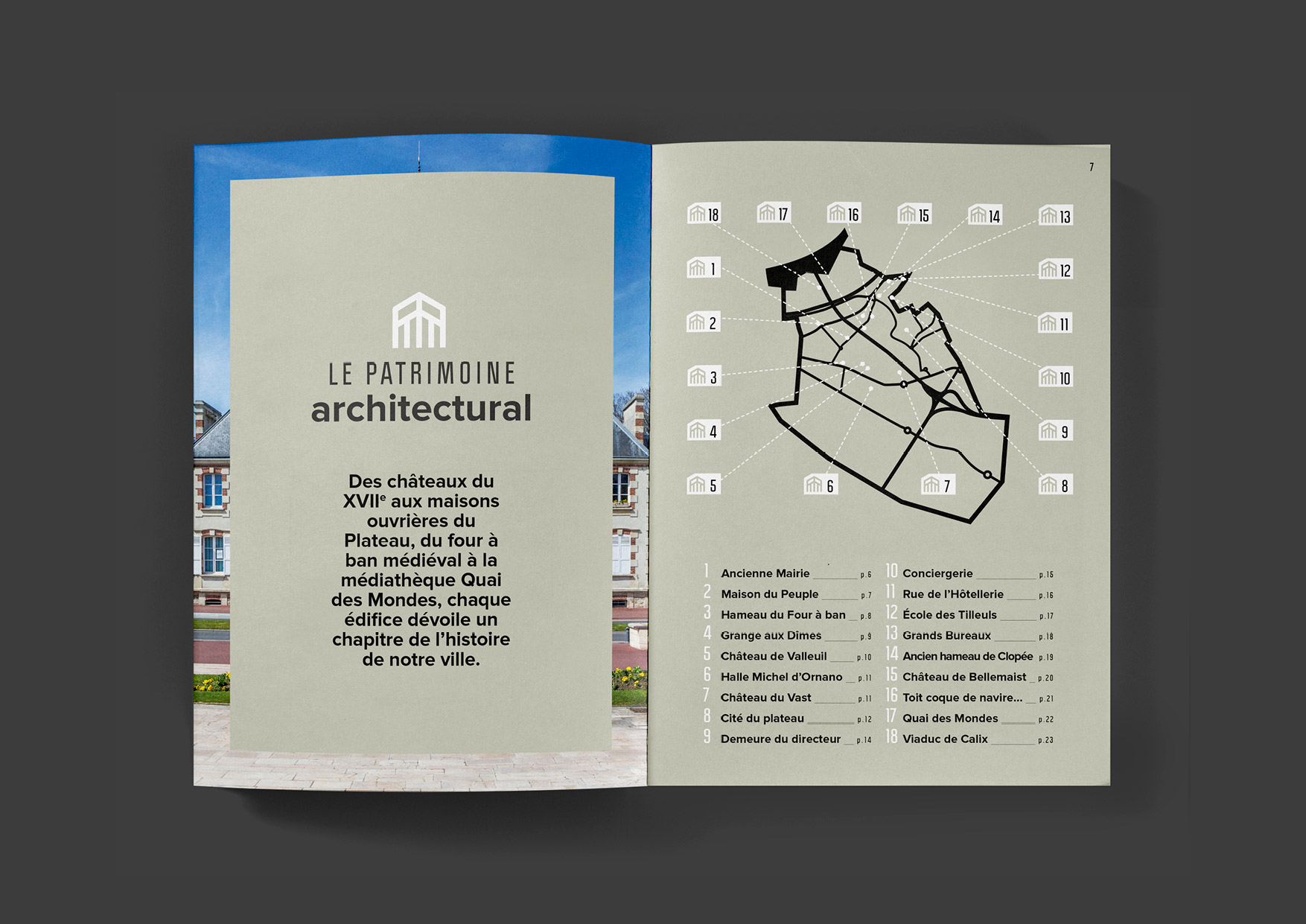 La ville de Mondeville conjugue avec succès développement économique avec plus de 500 entreprises et confort de sa population avec un environnement agréable. Cette ville de prés de 10 000 habitants a su développer les services et les infrastructures nécessaires pour cultiver sport et vie associative avec réussite. Elle souhaite aujourd'hui valoriser son patrimoine riche et varié, mais souvent méconnu, en développant différents outils de communication : un guide brochure, un parcours fléché et des totems d'informations. La ville m'a confié la création de cette nouvelle identité "Patrimoine".